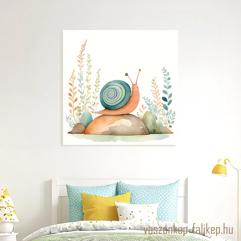 Derűt és játékosságot sugárzó akvarell falikép egy mosolygós csigával.