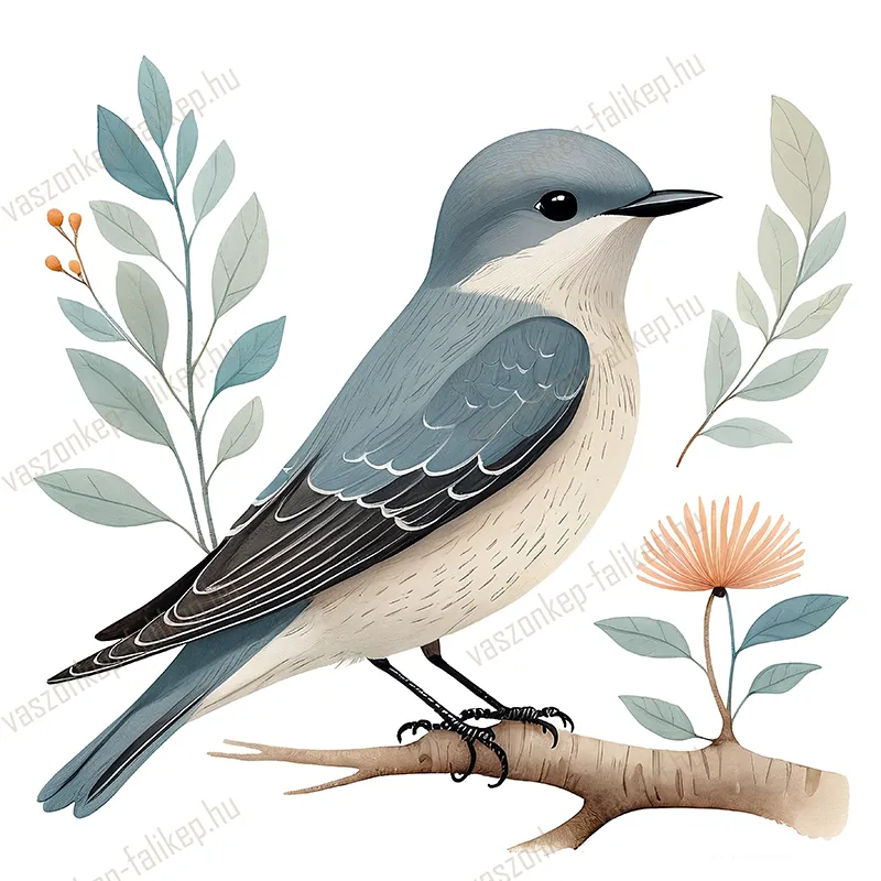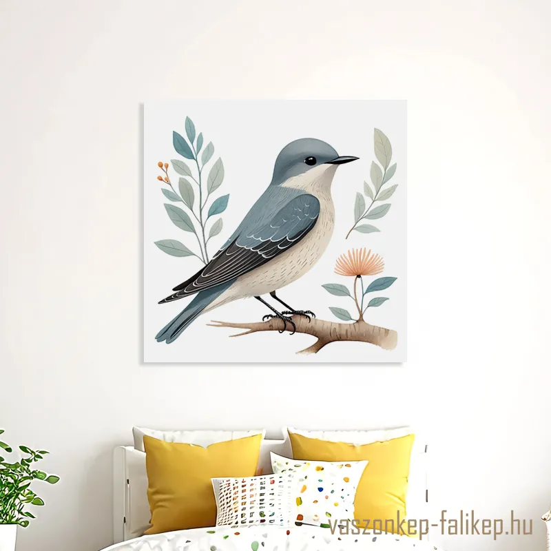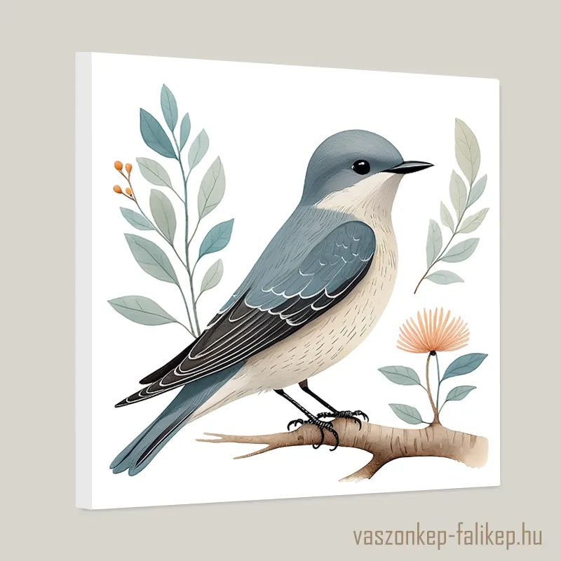 Lágy színekkel festett, elegáns madárillusztráció botanikai elemekkel – nyugalmat árasztó prémium falikép.