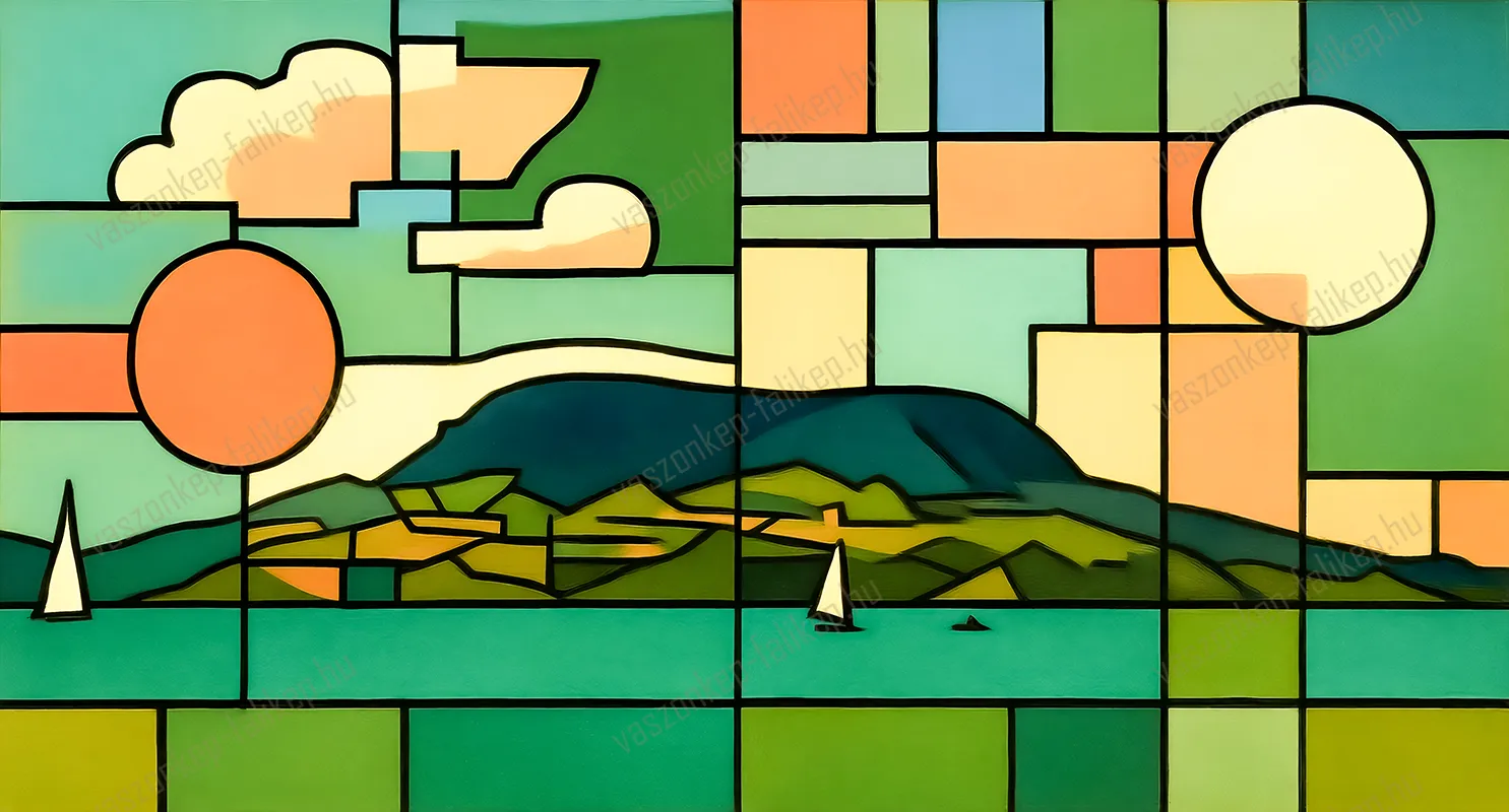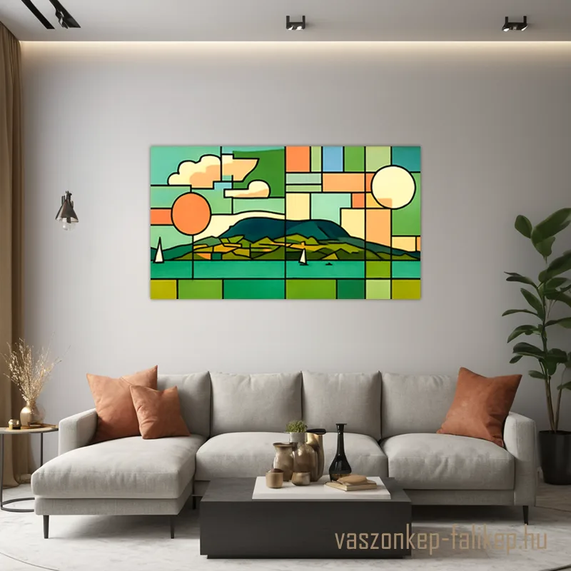 Modern, geometrikus hangulatú prémium vászonkép a Balaton ihlette tájjal.