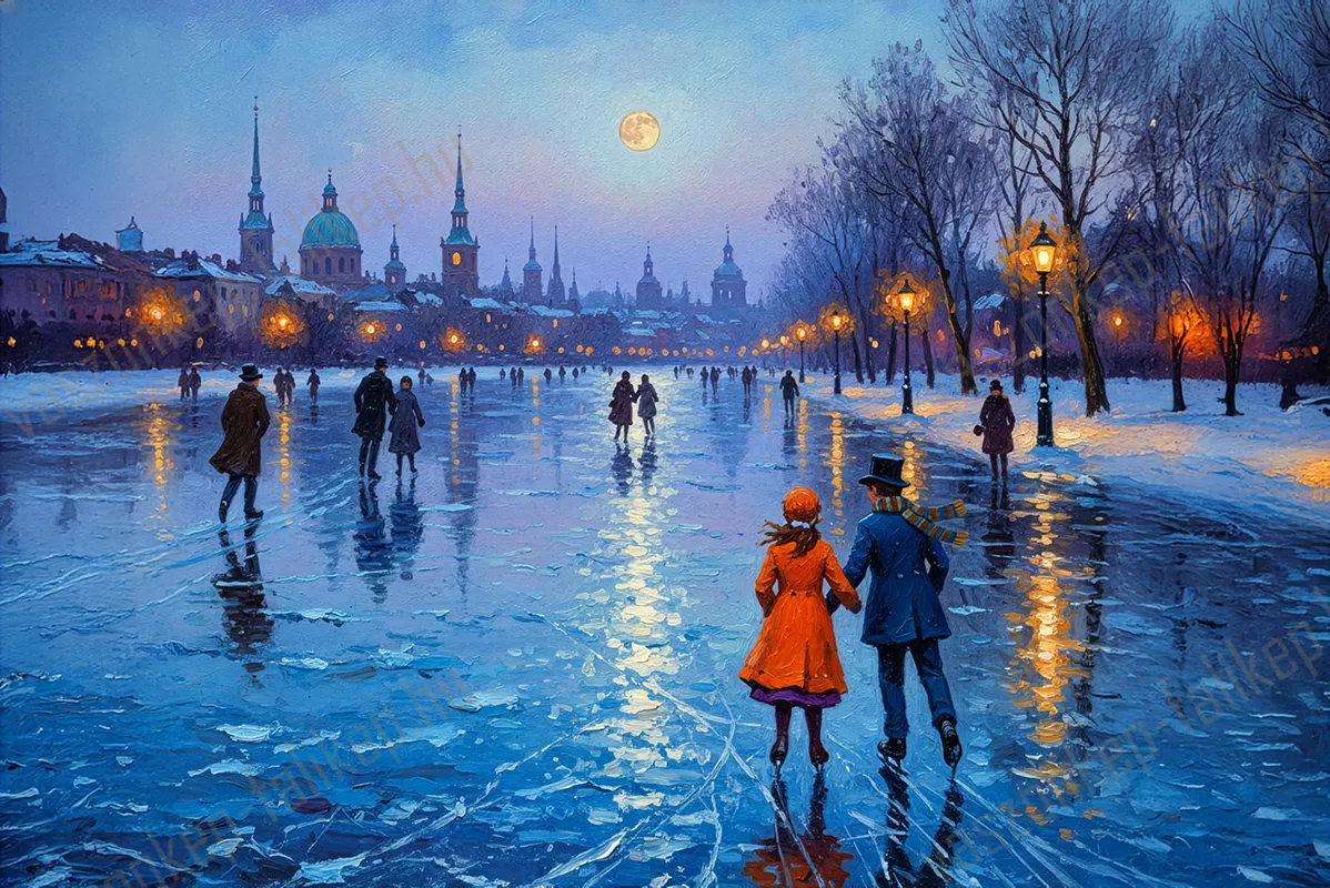 Romantikus téli jelenet, ahol emberek korcsolyáznak a befagyott folyón. A városi fények és a telihold meghitt atmoszférát teremtenek.