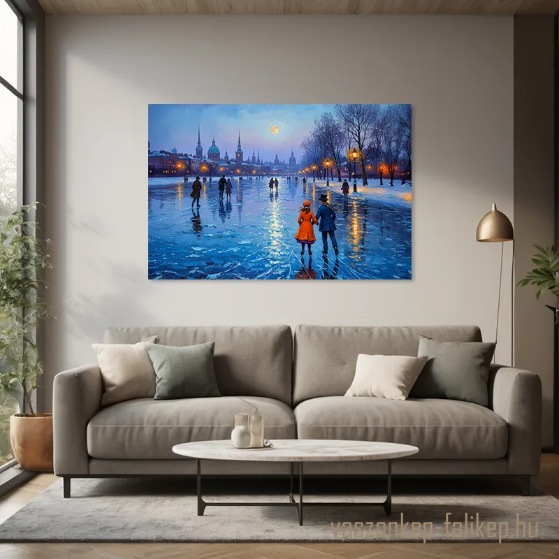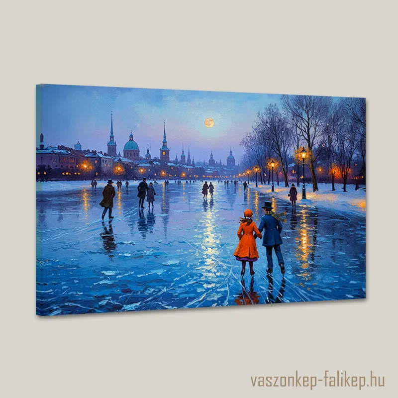 A „Korcsolyázás a befagyott folyón falikép” különleges hangulatot visz otthonodba. Ez a prémium falikép egy festői téli pillanatot örökít meg: emberek korcsolyáznak egy fagyott folyó tükrén, miközben a telihold fénye lágyan visszaverődik a jégen. A háttérben meleg városi fények ragyognak, amelyek meghitt kontrasztot alkotnak az éjszaka hűvös tónusaival.