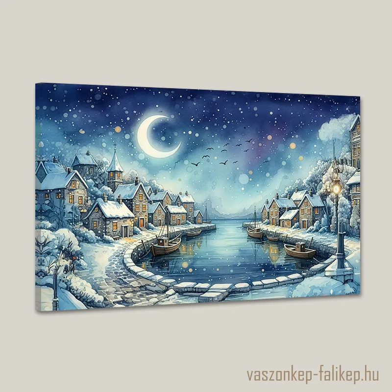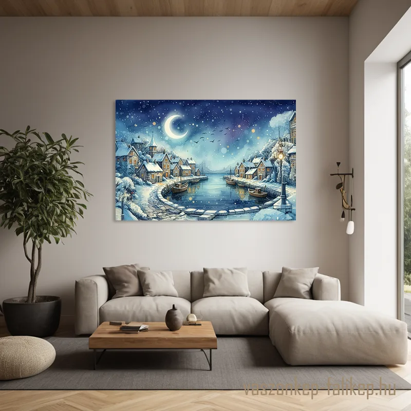 Hóborította falu és csillagos égbolt találkozása – a Téli holdfényes kikötő vászonkép elegáns, nyugodt hangulatot teremt bármely térben.