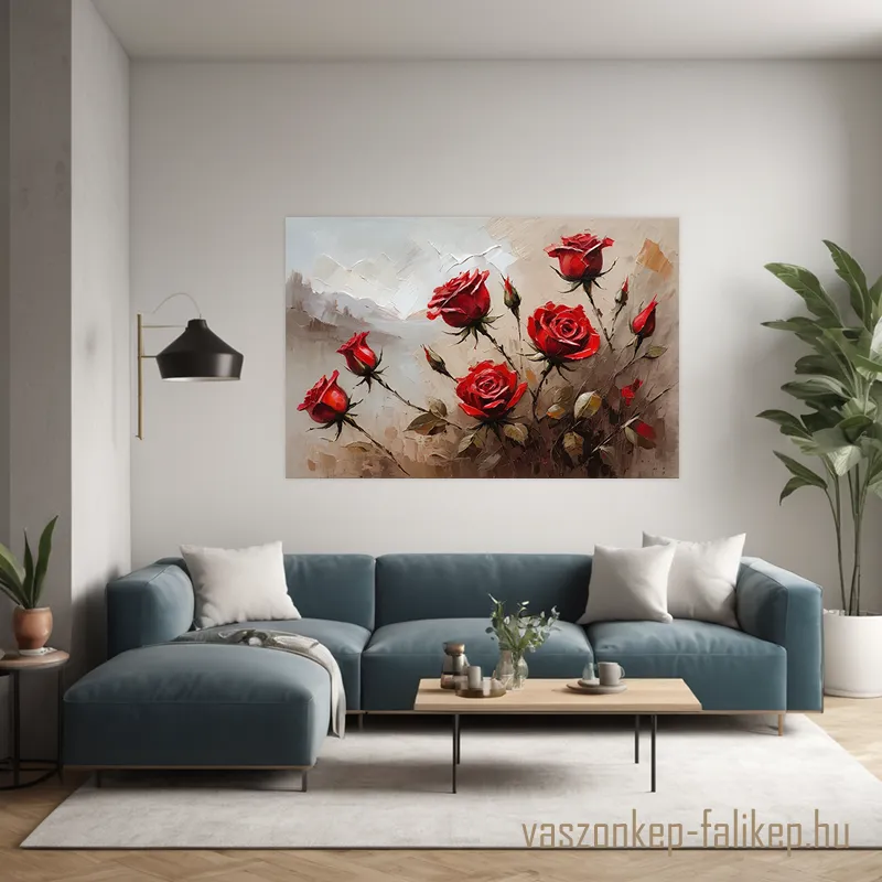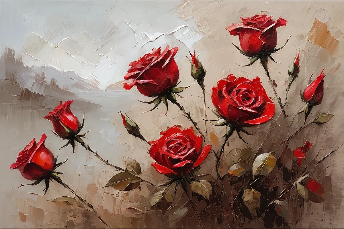A Vörös rózsák falikép az időtlen szépség és a kifinomult hangulat megtestesítője. A festmény hat élénk vörös rózsát ábrázol, amelyek a lágyan elmosódott bézs és barna háttér előtt ragyognak. A virágok minden egyes szirma gondosan kidolgozott, így a kép természetes fényben is élettel teli hatást kelt. Ez a prémium nyomat visszafogott eleganciájával bármely helyiségbe harmóniát hoz.