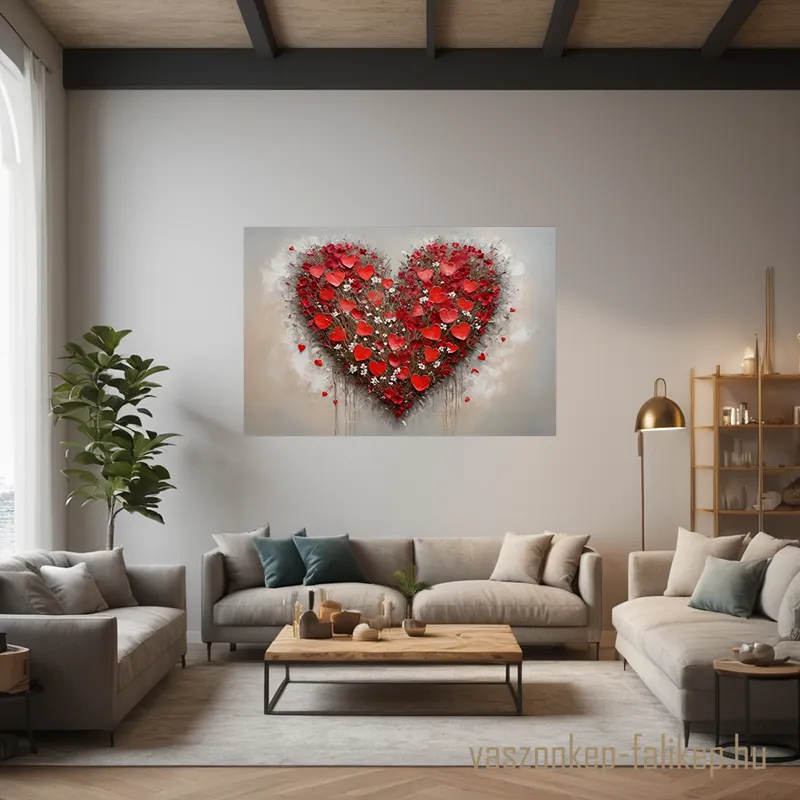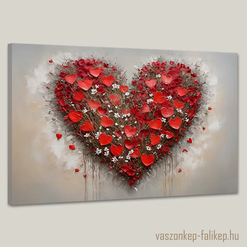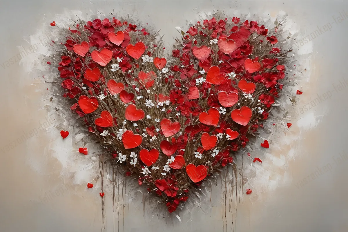 Romantikus hangulatú, prémium minőségű falikép vörös és fehér virágokkal formázott szív motívummal.