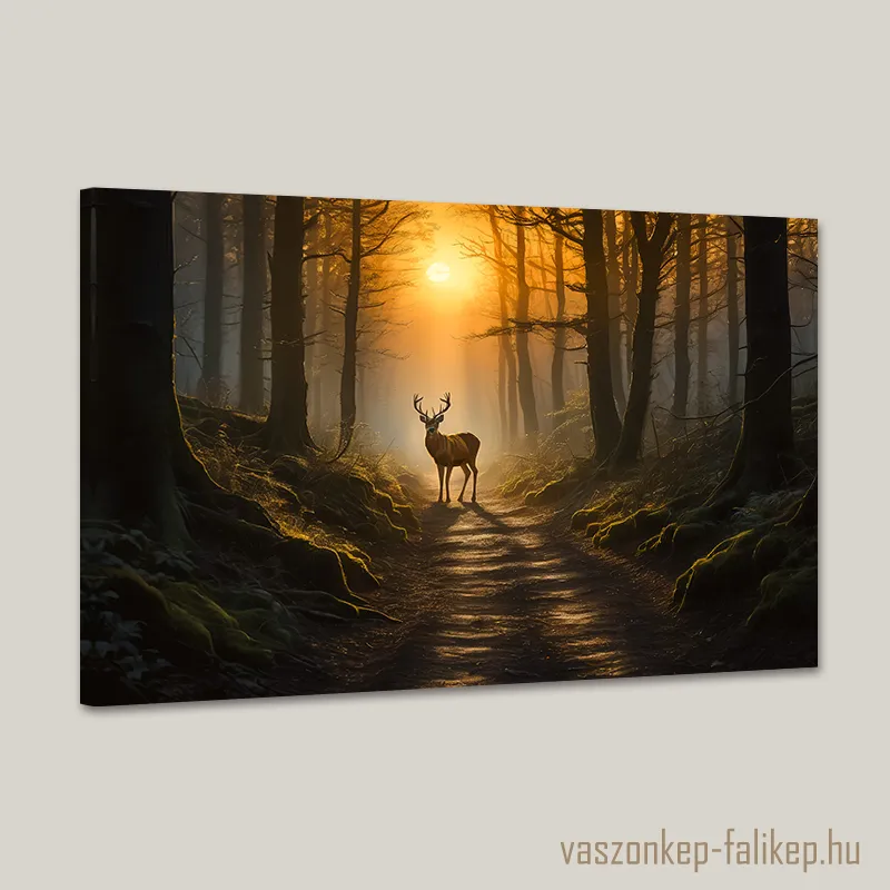 A „Szarvasbika a napnyugtában” prémium vászonkép egy varázslatos pillanatot idéz: a természet nyugalmát és az erdő méltóságát.